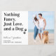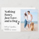 Let your Best Dog announce your wedding with this modern and elegant 'Nothing Fancy, Just Love, and a Dog' pet dog save the date postcards. These budget wedding invitation cards have an envelope option. Customise with your favourite engagement photo, dog's photo, or photo with the dog , and personalise with names, date, and wedding location. These dog wedding invitations are a must for dog lovers and dog moms! COPYRIGHT © 2020 Judy Burrows, Black Dog Art - All Rights Reserved. Nothing Fancy Just Love Dog Wedding Save The Date