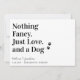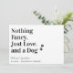 Nothing Fancy Just Love and a Dog! Let your Best Dog announce your wedding with this modern and simple 'Nothing Fancy, Just Love, and a Dog' pet dog save the date cards. Customise with names, date, and wedding location. This dog wedding save the date announcement will be a hit with your family and friends. COPYRIGHT © 2020 Judy Burrows, Black Dog Art - All Rights Reserved. Nothing Fancy Just Love Dog Save The Date Announcement Postcard