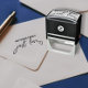 After ordering it, using your simple design template, the stamp came safely to more door within a week. Excellent service. It works beautifully. I am delighted.