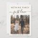 Elegant light cream elopement or small wedding announcement and casual reception invitation. The front features your wedding day photo and "Nothing Fancy Just Love" in a mix of simple typography and a stylish script with swashes. Under your photo, add your first names and wedding or reception date. On the reverse side, personalise your details and add your names in a signature-like script.