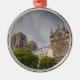 This is the facade of Notre Dame de Paris, a gothic cathedral in Paris, France. The beautiful architecture of this mediaeval church and the exterior of the stained glass windows are on display underneath a stormy sky filled with clouds. Notre Dame is also known as Our Lady of Paris.