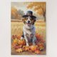 A watercolor-style painting of a cheerful dog sitting amidst a pile of vibrant fall leaves, surrounded by tiny pumpkins and scattered acorns. The dog wears a little pilgrim hat and beams with joy, capturing the spirit of Thanksgiving. In the background, soft harvest fields and golden-hued trees create a peaceful countryside ambiance. Gentle textures and warm, muted autumn tones give the scene a cosy, nostalgic feel perfect for celebrating the beauty of the season.