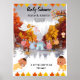 An autumn illustration of a vast white snowy background with the silhouettes of mountains and trees in the distance. The mountains and trees stretch far into the horizon, creating a serene and tranquil atmosphere. The ground is covered with vibrant orange and yellow leaves, adding a pop of color to the scene.