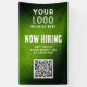 Now Hiring Banner with QR Code: Capture attention and streamline your hiring process with this eye-catching banner. Featuring the distinctive green grunge gradient background, this banner prominently displays your company's logo alongside a QR code that links directly to your online job listings. Ideal for job fairs, corporate events, or placement outside your business premises, this banner effectively communicates your hiring needs while reinforcing your brand identity.