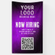 Now Hiring Banner with QR Code: Capture attention and streamline your hiring process with this eye-catching banner. Featuring the distinctive purple grunge gradient background, this banner prominently displays your company's logo alongside a QR code that links directly to your online job listings. Ideal for job fairs, corporate events, or placement outside your business premises, this banner effectively communicates your hiring needs while reinforcing your brand identity.
