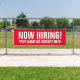 NOW HIRING big custom outdoor banner for business or company seeking personnel. Attach to fence, balcony or wall. Red or custom colour with bold typography. Custom outdoor and indoor signs for attracting staff, worker, coworkers, corporate colleagues etc. Help people find their job in your restaurant, shop, store, office, market and other places. Quick and easy templates for business owners. Enquire for all positions.