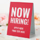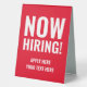 Now Hiring business employment table tent sign for desk. Get your job offers and positions noticed. Hire office workers, company staff, restaurant personnel and other employees. Handy for shop, store, corporate business, market etc. Get new workers applying instantly. Modern bold typography template with red or custom colour background. Add your own slogan or website address.