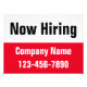 The top portion of the sign is white. Black display text is at the top. You can edit the text to show a custom message. (Shown: Now Hiring) The bottom portion is bright red with white text. There are two lines of display text at the bottom. You can edit them to show a custom message such as your company name and phone number.