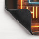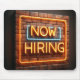 A neon sign with "NOW HIRING" text is mounted at an angle on a brick wall glowing with a bright orange lighting