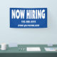 Now Hiring sign banner in white on blue background (or change the background colour if you like) for attention getting notice that your business is offering employment. Now available in smaller size for window or small display area. Edit the information lines to add your own contact info or other text.