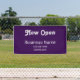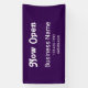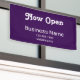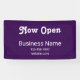This now open banner has a white text you can customise. This dark purple banner currently says Now Open. Additional lines of text are available for your business name, website and phone number.