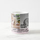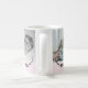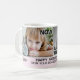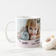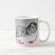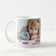 Cute and lovely father's day coffee mug featuring two customisable photographs of your daughter, an actual colour one on one side, and a newborn black and white one on the other side (black & white effect gets automatically applied). Below the pictures, the customisable texting in dark grey fonts reads Happy father's day from your biggest fan, with the name of the child, the current year, and her year of birth on a light pink background.