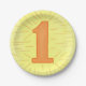 Painting of number one in orange on a background of yellow, with orange lines, is printed on paper plates. Use this fun design to celebrate the first birthday.