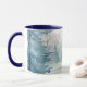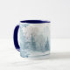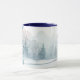 Coffee mug with inspirational quote scripture depicts a blue and white winter watercolor landscape with a winding stream of water surrounded by simple snow covered pine trees. It features Bible Verses Numbers 6:24-26, "The LORD bless you and keep you; The LORD make his face shine on you and be gracious to you; The Lord turn his face towards you and give you peace."