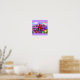 Whimsical Catholic Nuns art poster, "Heading to Church", bright, bold colours of tiny convents on the purple mountainside depict nuns of two different orders heading to Sunday morning mass. Perfect for any home or office.