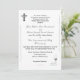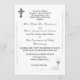 Design front features a pure white background to the elegant image of a silver crucifix at top left corner. Bottom right corner displays the image of the Holy Eucharist suspended above chalice with the image joined wedding rings displayed beside it. Following the traditional format for a Catholic wedding invitation, text is featured in an elegant black font. The names of bride and groom, along with event are displayed in a graceful Nuptial font. Design is accented by an elegant flourish aligning the left and right sides.
