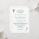 Design front features a pure white background to the elegant image of a silver crucifix at top left corner. Bottom right corner displays the image of the Holy Eucharist suspended above chalice with the image joined wedding rings displayed beside it. Following the traditional format for a Catholic wedding invitation, text is featured in an elegant blue font. The names of bride and groom, along with event are displayed in a graceful Nuptial font. Design is accented by an elegant flourish aligning the left and right sides