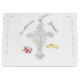 Design features the soft image of a crucifix at centre. The names of Bride and Groom are encircled above in an elegant, silver-coloured Nuptial font. The small image of a pink rose graces the bottom left, while the image of golden wedding rings is depicted at right. Designed to coordinate with the "Nuptial Rose Traditional Catholic Wedding Suite."