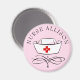This magnet features a nurse's cap with a cross on it along with a decorative flourish below. Above is a nurse's name for you to personalise. Background is pink but may be customised. Perfect for a nurse or nursing school graduate.