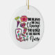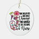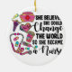 Nurse design ceramic ornament features tie dyed effect objects including a nurse cap, caduceus, stethoscope, hypodermic needle, bandage, cup of coffee, and black text that reads She Believed She Could Change the World So She Became a Nurse!