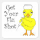 Get your flu shot in curly text with a cute yellow chick nurse holding a hypodermic needle is a funny gift design with a healthcare message.