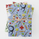 Creative nurse giftwrap patterns featuring unique medical-themed nursing supplies on blue, green and pink backgrounds.