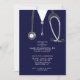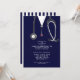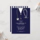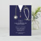 Creative nursing school graduation invites featuring navy blue hospital scrubs and a stethoscope. Edit text to create unique nurse party invitations or grad announcements.