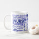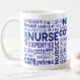 A wraparound blue word typography mug celebrating the values and identity of nurses. The layout highlights qualities such as compassion, empathy, care, kindness, knowledge, skill, expertise, dedication, and medicine. Made specifically for registered nurses, nursing aides, new graduates, and nursing students. A meaningful appreciation and thank you gift for Nurse Appreciation Week, graduation, or everyday recognition.