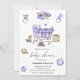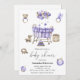 The invitation shows watercolor a baby cradle, a nursery mobile in the form of purple round clouds, children's toys: a rodent elephant, a duck on wheels, a teddy bear, a bunny, a bib, a pacifier, a pyramid.