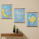 Three hanging tapestries that match for your little one's nursery. Moon with stars, Dream Big, and another moon with a smiling face with stars, Colours are blue and yellow.