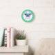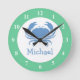 Nursery wall clock with blue crab and baby name. Cute gift idea for little kids room. Blue and green nursery decoration with personalizable name. Sealife animal cartoon.