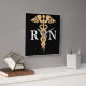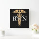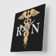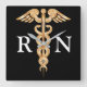 The clock has a black background with a beautiful gold tone colour caduceus symbol in the middle with "RN" in white letters.