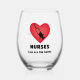 This Stemless Wine Glass design has a red heart with a shot and text that reads “NURSES CALL ALL THE SHOTS”. On the back of the glass you can add a name.