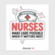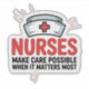 This heartwarming sticker honours the compassion and dedication of nurses with a clean, cheerful, and playful design. At the top is a simple cartoon syringe or nurse cap with a red cross—instantly recognisable healthcare symbols. Below it, the bold text “NURSES” is featured in large, uppercase letters in a vibrant colour like red or blue, followed by the message “MAKE CARE POSSIBLE WHEN IT MATTERS MOST” in thinner black uppercase type. Ideal for nurse gifts, hospital decor, or scrubs accessories, this sticker is a tribute to those who provide care and comfort when it’s needed most.