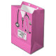 Creative nurse gift bag featuring pink hospital scrubs, stethoscope and a Swiss Army knife. Edit text to add nurse's name.