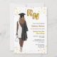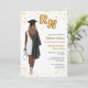 Nursing School Graduation Party Invitation. Nurse Invitation for your daughter, niece, mother, aunt, cousin, or friend who is graduating from nursing school and is now officially a nurse. Female Nursing School Graduation Invitation for grad parties celebrating women who just graduated from nursing school. Celebrate the new Registered Nurse with this elegant nursing graduation invitation! Featuring illustrated portrait of a dark skin woman with long curly hair. The nurse grad is wearing a stylish white dress, a black graduation robe draped over her shoulder, and a matching black graduation cap. She holds gold foil style balloons with the letters RN in one hand and a stethoscope in the other hand. Accented with shimmering gold confetti, it perfectly captures the joy and excitement of her big achievement.