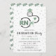 Nursing shool class of 2026 stethoscope sage green RN graduation Invitation. This feminime girlyRegistered Nurse graduation invitation features a black stethoscope with a graduation cap, a heart, a coquette bow, confetti and the initials RN in green. The back includes a pattern of the 'RN" initials.
