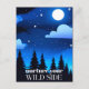 Postcard in a fantasy wilderness illustration of the night sky, with moon and stars over pine trees, and the caption "nurture your wild side"