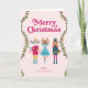 Cute Christmas greeting card featuring a hand drawn illustration of cat, dog, and mice in nutcracker ballet characters.