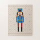 A Christmas puzzle with an illustration of a Nutcracker, some stars and red dots ornaments on a striped brown background. A nice gift for a gift at Xmas!