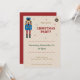 A Christmas party invitation in red, brown and green colours with an illustration of a Nutcracker, a bauble and some stars on a striped brown background. You could use it for Xmas party at home or in a company, a birthday and even for a New Year's Eve party!