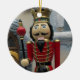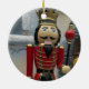 This colourful double sided Christmas ornament features a Nutcracker guard with a bright gold crown, standing outside a grotto.