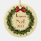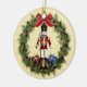 Beautiful red nutcracker doll in wreath round Joyeux Noël, French Christmas ornament. This lovely double sided holiday art ceramic ornament features a red nutcracker in the centre of a holiday wreath with pine cones and berries! The back also has a lovely wreath and bow with the words "Joyeux Noël" - Merry Christmas in French language, and the year! A wonderful addition to your ornament collection, holiday decor and a great gift for family, friends and someone who loves the nutcracker!