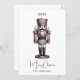 White background, and a dusty rose coloured nutcracker. Merry Christmas written with a trendy handlettered style script.