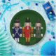 Christmas Nutcracker Trio - Three Nutcrackers are standing side by side on top of a solid green background. The first nutcracker is dressed in blue and white with gold embellishments. The centre nutcracker is dressed in red and gold with gold embellishments. The third nutcracker is dressed in green and white with silver embellishments. Each one of these nutcrackers are available separately on assorted Zazzle gifts and products. Choose either size of paper plates.