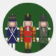 Christmas Nutcracker Trio -Three Nutcrackers standing side by side on top of a solid green background. The first nutcracker is dressed in blue and white with gold embellishments. The centre nutcracker is dressed in red and gold with gold embellishments. The third nutcracker is dressed in green and white with silver embellishments. Each one of these nutcrackers are available separately on assorted Zazzle gifts and products.