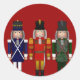 Christmas Nutcracker Trio -Three Nutcrackers standing side by side on top of a solid red background. The first nutcracker is dressed in blue and white with gold embellishments. The centre nutcracker is dressed in red and gold with gold embellishments. The third nutcracker is dressed in green and white with silver embellishments. Each one of these nutcrackers are available separately on assorted Zazzle gifts and products.