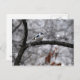 A tiny nuthatch perches on a tree limb as huge snowflakes fall.