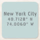 Latitude & Longitude map coordinates for the city of New York in modern industrial font