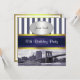 Customisable Invitations and accessories with an East River view of New York City's iconic Brooklyn Bridge and Municipal Building with a boat passing by. tint. It also features a navy blue and white stripe pattern, a navy and gold ribbon and a white gradient label with your choice of a silver or gold colour pearl frame. Image is in a blue & white tint. The reverse is framed in gold.